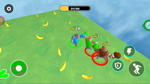 1、左侧虚拟摇杆控制移动方向,右侧按键可触发跳跃、护盾或加速等技能,注意规避高等级对手,优先收集香蕉以促进进化。