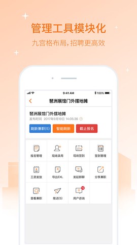 1、极速摇人:不用到处发帖求爷爷告奶奶,APP 直接线上招募,兼职人员快速到岗,就像组队打副本一样快。